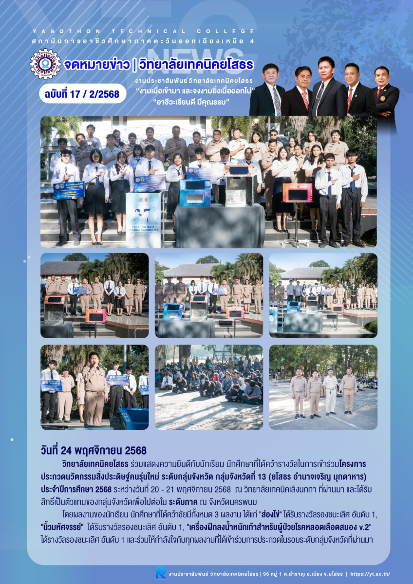 ร่วมแสดงความยินดีกับนักเรียน นักศึกษาที่ได้คว้ารางวัลในการเข้าร่วม “โครงการประกวดนวัตกรรมสิ่งประดิษฐ์คนรุ่นใหม่ ระดับกลุ่มจังหวัด กลุ่มจังหวัดที่ 13 (ยโสธร อำนาจเจริญ มุกดาหาร) ประจำปีการศึกษา 2568” 24/11/2025 admin กิจกรรม