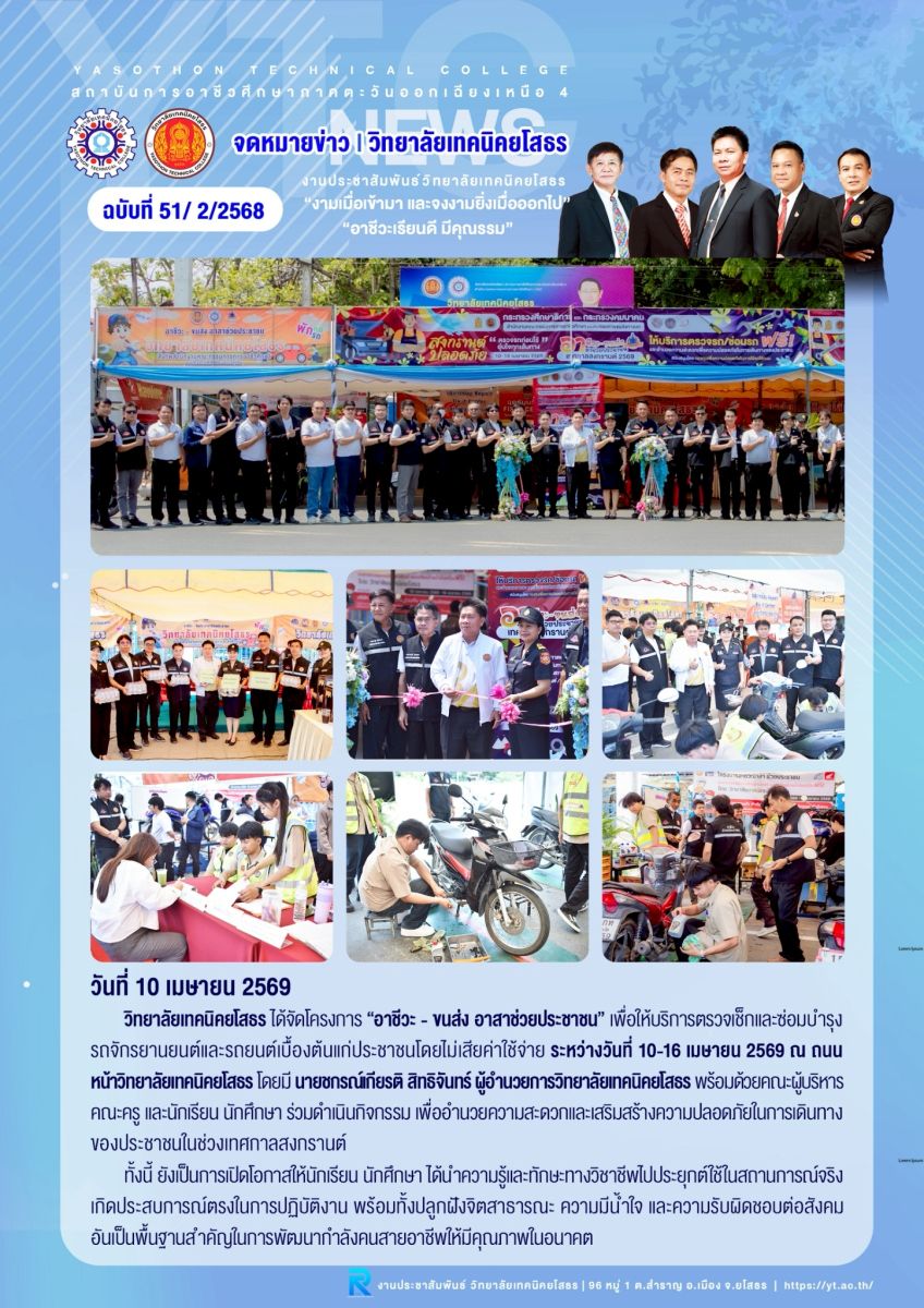 โครงการ “อาชีวะ – ขนส่ง อาสาช่วยประชาชน” เพื่อให้บริการตรวจเช็คและซ่อมบำรุงรถยนต์และรถจักรยานยนต์เบื้องต้นโดยไม่เสียค่าใช้จ่าย ระหว่างวันที่ 10 – 16 เมษายน 2569 ณ ถนน หน้าวิทยาลัยเทคนิคยโสธร 10/04/2026 admin กิจกรรม 1 2 ... 8 ►