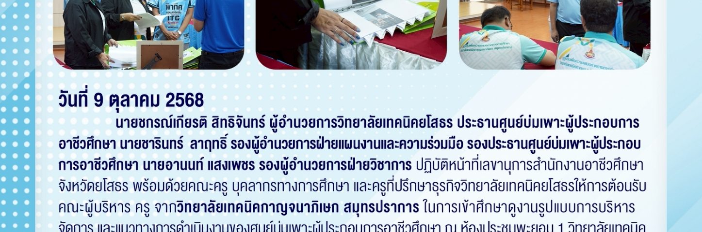 ต้อนรับคณะศึกษาดูงานจากวิทยาลัยเทคนิคกาญจนาภิเษก สมุทปราการ ในการเข้าศึกษาดูงานรูปแบบการบริหารจัดการ และแนวทางการดำเนินงานของศูนย์บ่มเพาะผู้ประกอบการอาชีวศึกษา 09/10/2025 admin กิจกรรม 1 2 ►